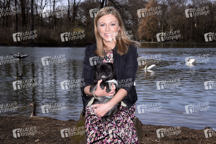Anna Ewelina beim Spaziergang mit Hund Resi am Kleinhesseloher See im Englischen Garten. München, 28. 03.2021
