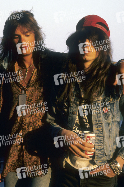 Musiker von Europe und Scott Hill von Skid Row bei einem Photoshooting im Milton Keynes Bowl. Milton Keynes, 18.08.1989