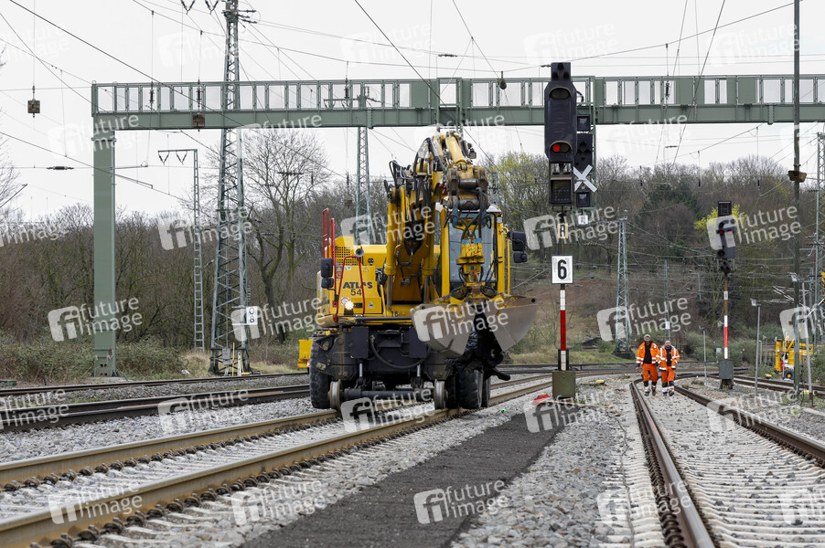 Zweiwegebagger beim Fototermin 'Endspurt für das Elektronische Stellwerk (ESTW) Linker Rhein' am Bahnhof Köln-West. Köln, 13.03.2024