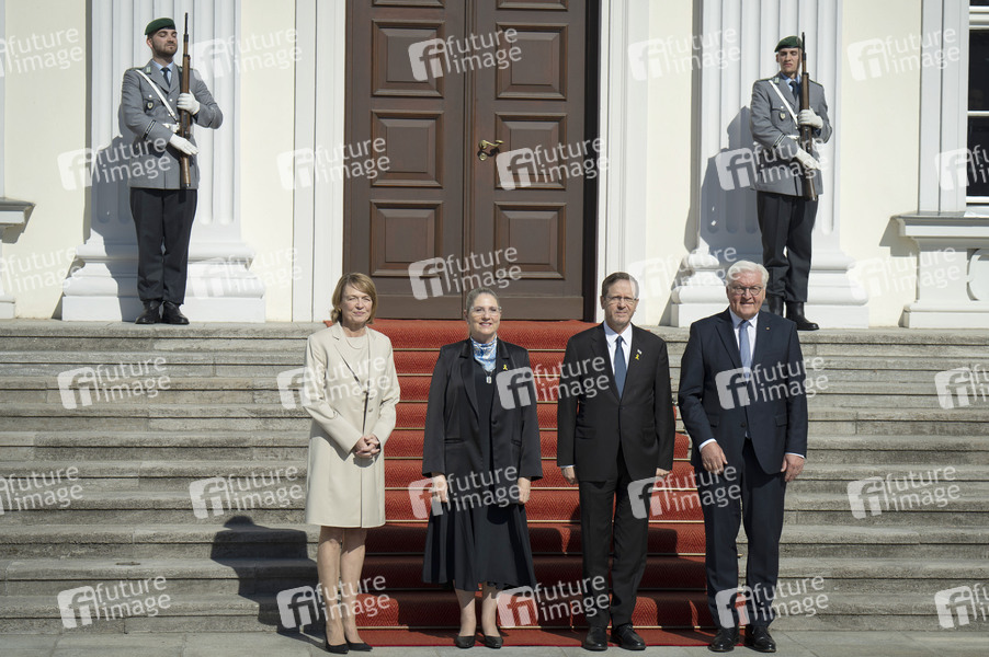 Elke Büdenbender, Michal Herzog, Isaak Herzog und Frank-Walter Steinmeier beim Empfang des israelischen Staatspräsidenten mit militärischen Ehren im Schloss Bellevue. Berlin, 12.05.2025