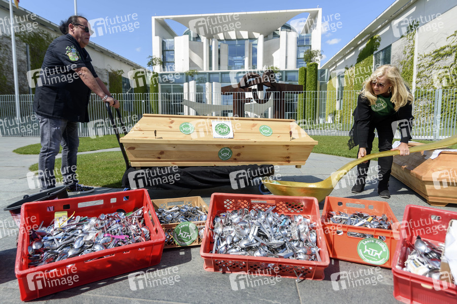 Unter dem Motto 'Wir geben den Löffel ab!' protestieren Gastronomen, Hoteliers und Veranstalter der Initiative Leere Stühle vor dem Bundeskanzleramt in Berlin. Zur Unterstützung von Gastronomen in der Corona-Krise haben sie über 20 000 Löffel gesammelt. Sie fordern: Soforthilfe, Fahrplan, Senkung der Mehrwertsteuer auf 7 Prozent und Erhöhung des Kurzarbeitergeldes auf 90 Prozent. Berlin, 15.05.2020