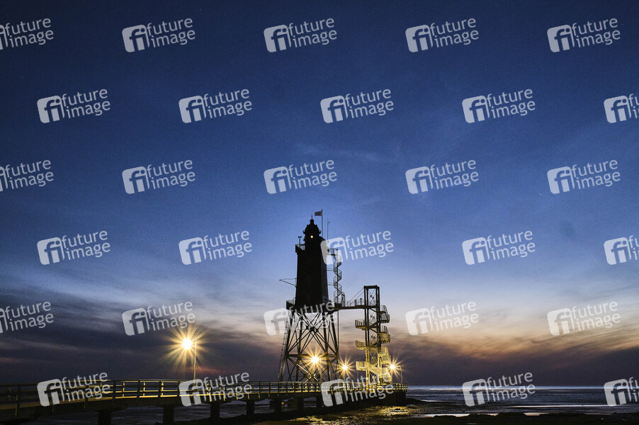 Eversand-Oberfeuer, Turm, Höhe 37.4 m, Gitterkonstruktion, runde Laterne, Sedhenswürdigkeit, Befeuerung, Schifffahrtszeichen, Positionsbestimmung, Nacht, Nachtaufnahme, Sternenhimmel