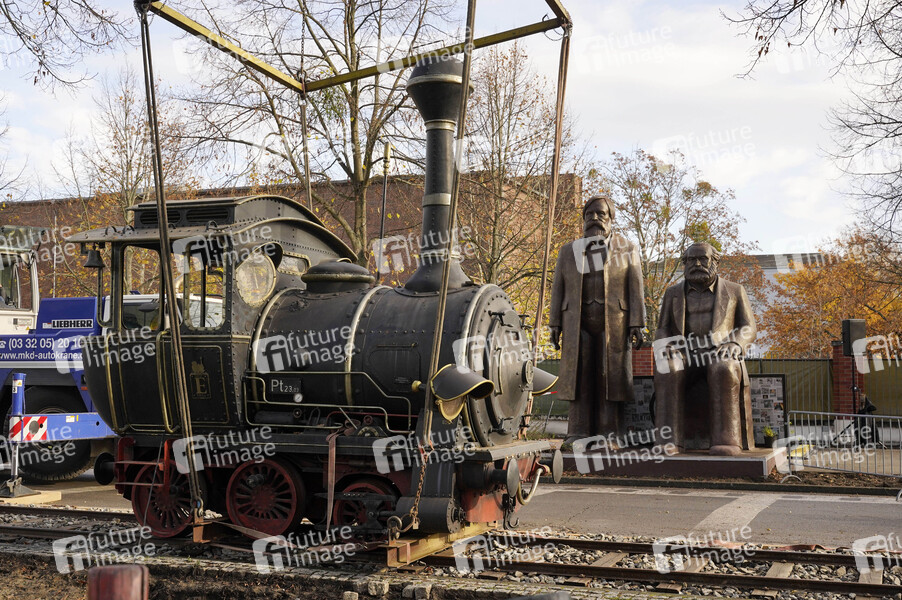 Ein weiteres Filmrequisit für die 'Giant Props' Sammlung ungewöhnlicher Originale, die Lokomotive Emma aus den Jim Knopf Filmen, wird auf der Straße der Giganten im Filmpark Babelsberg aufgestellt. Filmparkchef und 'Lokomotivführer' Friedhelm Schatz organisiert den Transport. Potsdam, 16.11.2020