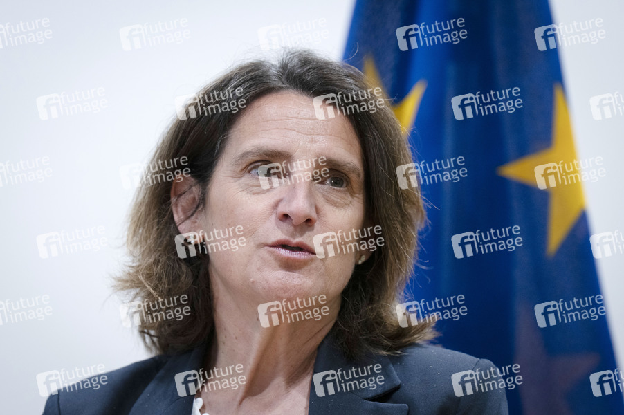 Teresa Ribera beim gemeinsamen Pressestatement der Bundesministerin für Wirtschaft und Energie und der Exekutiv-Vizepräsidentin der EU Kommission im Bundesministerium für Wirtschaft und Energie. Berlin, 19.05.2025