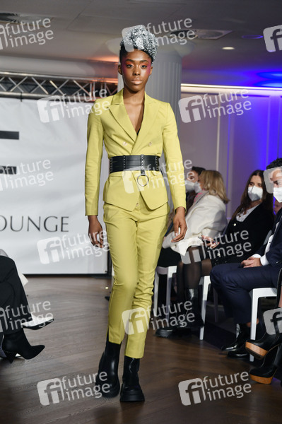 Model bei der Frankfurt Fashion Lounge mit der Opening Show Eyecandy Frankfurt 'Protect ýo heART' Artist Flashmob und der Runway Show 'WeDress to Express' von WeDress Collective im Rahmen der Frankfurt Fashion Week Herbst/Winter 2022 im Sofitel Frankfurt Opera. Frankfurt, 19.01.2022