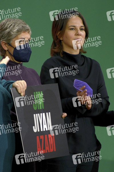 Britta Hasselmann und Annalena Baerbock bei einer Solidaritätsbekundung mit den Frauen bei den Protesten im Iran bei der 48. Ordentlichen Bundesdelegiertenkonferenz von Bündnis90/Die Grünen im World Conference Center. Bonn, 15.10.2022