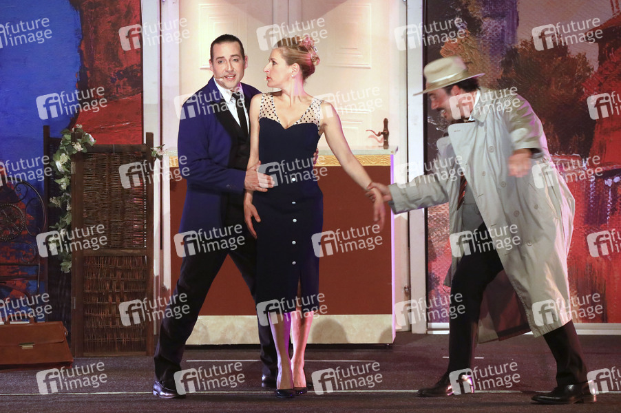 Stuart Sumner, Stefanie Hertel und Sascha Hödl bei der Musicalpremiere 'Ganz Paris träumt von der Liebe' im Kulturhaus. Gotha, 12.04.2024