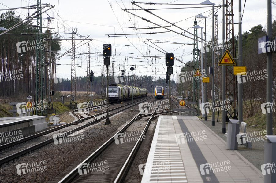 Güterbahnhof Fangschleuse mit abgestelltem Güterzug. Die Erweiterungspläne für die Fabrik des Elektroautobauers Tesla in Grünheide (Oder-Spree) bei Berlin sind bei einer Einwohnerbefragung mehrheitlich auf Ablehnung gestoßen. Doch das Votum ist letztlich nicht bindend. Tesla will neben dem 300 Hektar großen Werksgelände einen Güterbahnhof, Lagerhallen und einen Betriebskindergarten errichten. Dafür müssten aber rund 100 Hektar Wald gerodet werden. Das ist umstritten. Es gibt Befürworter der Pläne, aber auch Ablehnung einer Tesla-Erweiterung (Quelle: rbb24). Grünheide, 23.02.2024
