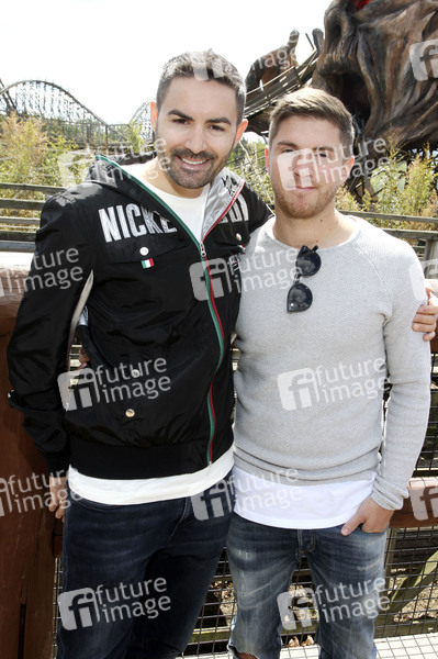 Menderes Bagci und Joey Heindle beim Fototermin an der Holzachterbahn Colossos im Heide Park Resort. Soltau, 14.05.2019