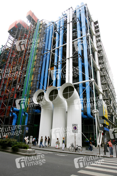 staatliches Kunst- und Kulturzentrum, Architekten Renzo Piano & Richard Rogers & Gianfranco Franchini, nach einer sechsjährigen Bauzeit am 31. Januar 1977 eröffnet, beherbergt das Musée National d'Art Moderne & Bibliothèque Publique d'Information & das Musikforschungszentrum IRCAM (Institut de Recherche et Coordination Acoustique/Musique), die Belüftungsrohre sind weiß bemalt, die Beförderung rot, Elektrik gelb, Wasserrohre grün, Rohre der Klimaanlage blau