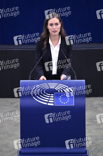 Sanna Marin spricht vor dem Parlament im Plenarsaal des Europäischen Parlaments. Straßburg, 13.09.2022