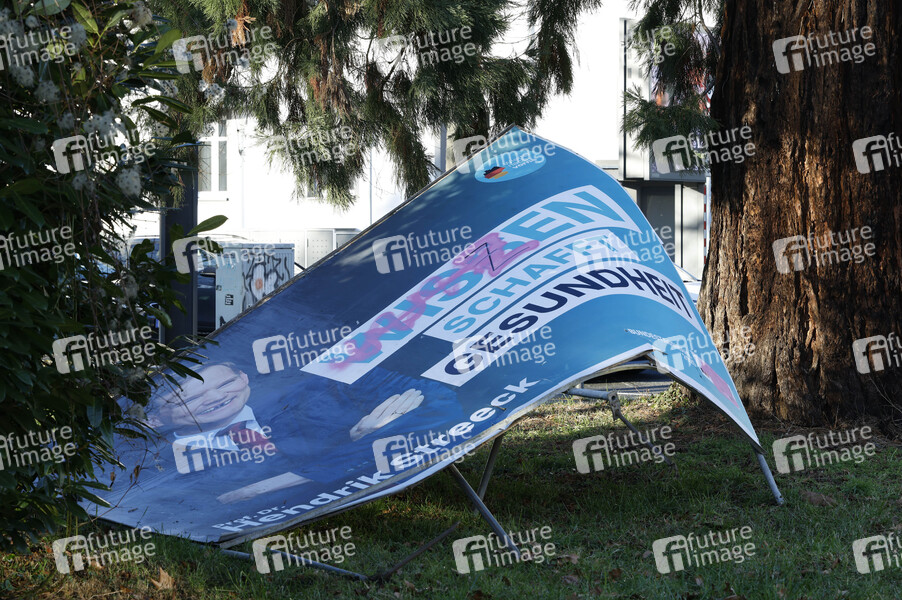 Beeinflussung der Wählerin, Botschaft, Bundestagswahl, Bundestagswahlen, Bundestagswahlkampf, Eigenwerbung, Großflächenplakat, Kampagne, Kandidat, Kandidaten, Kandidierende, Logo, Partei, Partei-Symbol, Parteien, Parteienwerbung, Parteilogo, Plakat, Plakatkampagne, Plakatständer, Politik, Politiker, Politikerinnen, Protestwähler, Slogan, Stammwähler, Wahl, Wahlbeeinflussung, Wahlbeteiligung, Wählen, Wählerschicht, Wählerschichten, Wahlkampagne, Wahlkampf, Wahlkampfmodus, Wahlkandidat, Wahlprogramm, Wahltermin, Wahlwerbung, Wirkung, Wirkungsmacht, Strafen, Eigentum der jeweiligen Partei, Beschädigen, Beschädigung, Geldstrafe, Schadensersatz, Sachbeschädigung, Wahl-Plakate, CDU, Christlich Demokratische Union Deutschlands, Symbolbild, Symbolfoto, Themenbild, Themenfoto, Hendrik Streeck