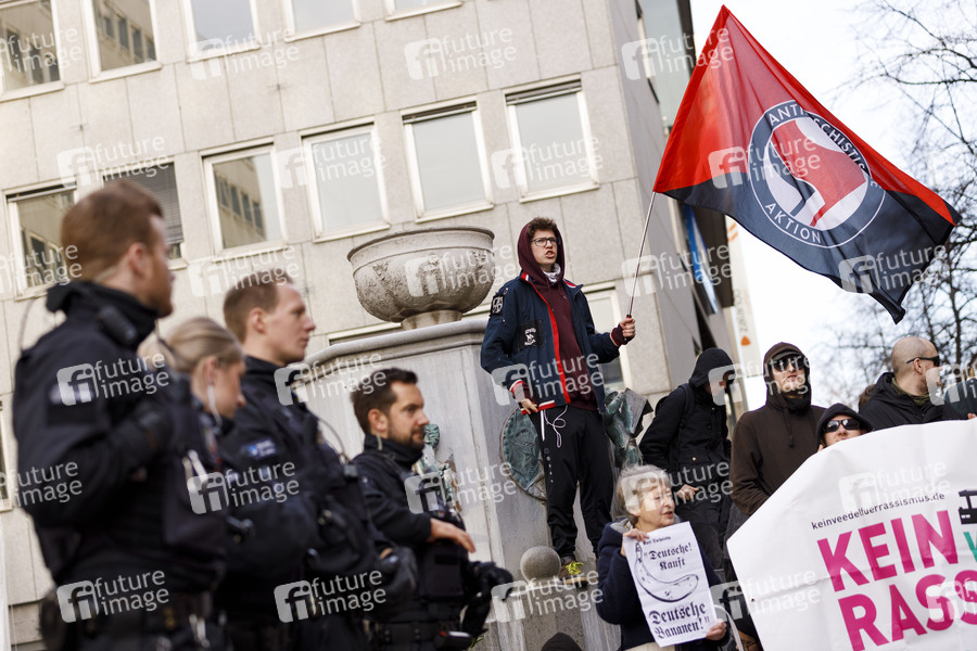Anhänger der Antifa demonstrieren gegen einen Informationsstand der rechten Gruppe 'Widerstand steigt auf' unter dem Namen 'Citadelle e.V.' am Hans-Hartmann Platz. Köln, 15.02.2020