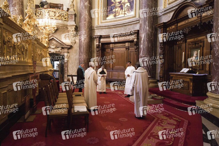 Im Berliner Dom wird der Festgottesdienst am Ostersonntag gefeiert. Durch die Kontaktbeschränkungen wegen Corona wird der Gottesdienst ohne Besucher abgehalten und im Internet gestreamt. Die Domprediger Petra Zimmermann, Michael Kösling, Thomas Müller und Maximilian Ilgner halten den Gottesdienst ab. Berlin, 12.04.2020
