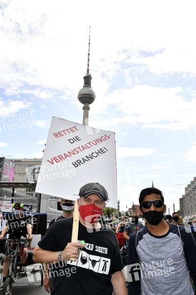 Mit einem Protestmarsch von derAlexanderstraße 3 zur Kundgebung am Bebelplatz, weisen Berliner Spielstätten, Veranstalter*innen, Techniker*innen, Bühnen- und Messebauer*innen, Außenwerber*innen, Security- und Gastropersonal sowie weitere Dienstleister*innen aus der Kultur- und Eventbranche auf ihre prekäre Lage und den eklatanten Mangel an Perspektiven hin. Berlin, 24.07.2020