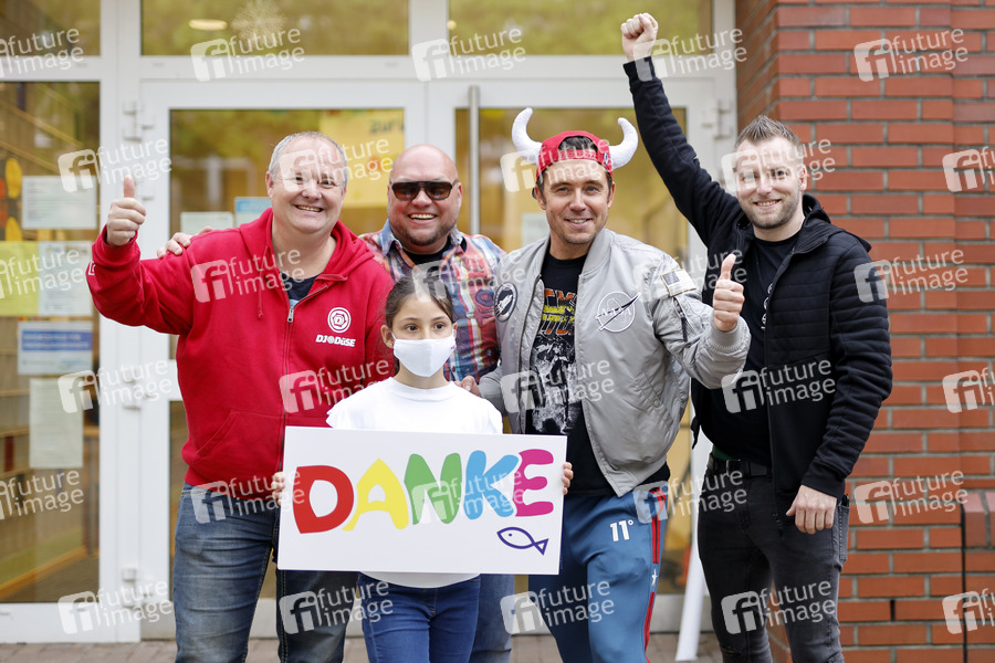 DJ Düse, Buddy, Lorenz Büffel und DJ Chris Mega mit Arche-Besucherin bei der Überreichung des Spendenschecks für die Kölner Arche. Mallorca-Stars haben beim großen Mallorca Opening 2021 auf der Streamingplattform Twitch rund 14.000 Euro für den guten Zweck gesammelt. Köln, 18.05.2021