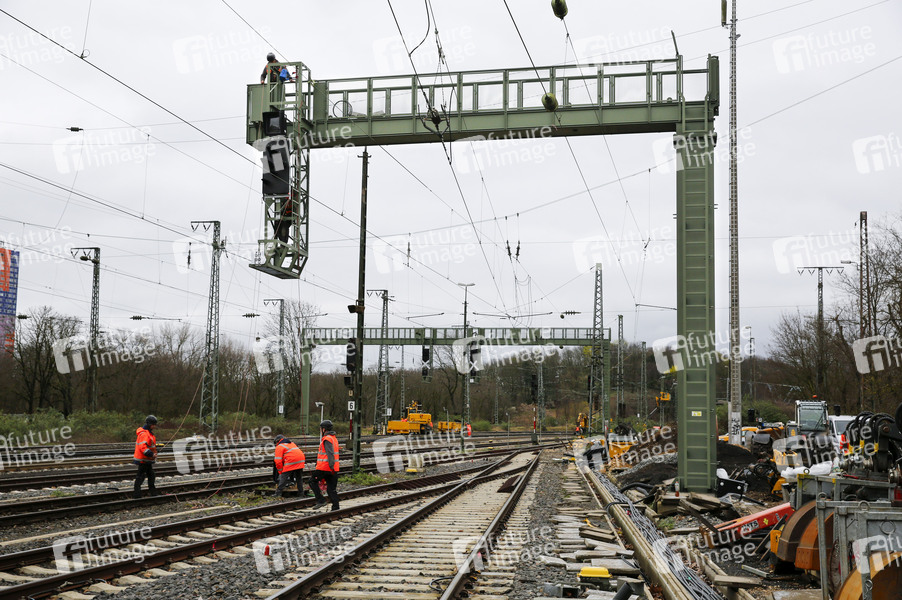 Installation Signalbrücke beim Fototermin 'Endspurt für das Elektronische Stellwerk (ESTW) Linker Rhein' am Bahnhof Köln-West. Köln, 13.03.2024