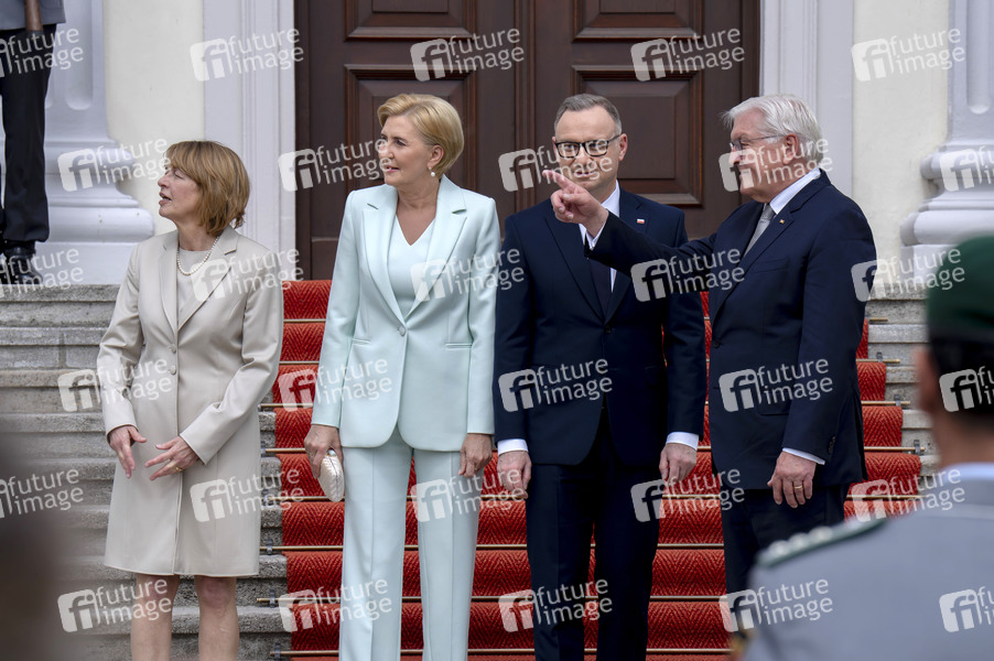 Elke Büdenbender, Agata Kornhauser-Duda, Andrzej Duda und Frank-Walter Steinmeier beim Empfang des polnischen Präsidenten mit militärischen Ehren im Schloss Bellevue. Berlin, 27.05.2025