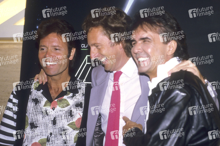Cliff Richard, Gast und Dave Clark bei einer Pressekonferenz zur Präsentation von Dave Clark's Konzeptalbum 'Time' im Savoy Hotel. London, 26.07.1985