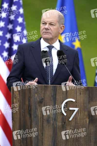 Olaf Scholz bei der Abschlusspressekonferenz zum G7-Gipfel auf Schloss Elmau. Klais, 28.06..2022