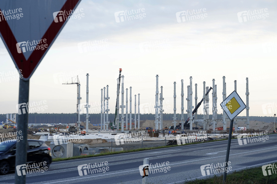 Elektroauto, Elektrofahrzeuge, PKW, Auto, Model Y, Model 3, Großfabrik, Automobilhersteller, Autobauer, Elektromobilität, umweltfreundlich, vorläufige Genehmigung, Batteriefabrik, Großprojekt, Investition, Baugenehmigung, Vorab-Genehmigung, E-Auto-Fabrik, Umwelt, Klimaschutz, Baustelle, Bauen, Baubranche, Bau-Branche, Bauarbeiten, Großbaustelle, Bagger, Kran, Kräne, Baustelle, Batterie-Fabrik