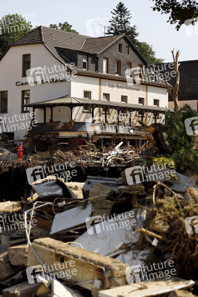 Nach dem Jahrhunderthochwasser in der Eifel durch heftige Regenfälle und Dauerregen mit Überschwemmungen und Überflutungen haben die Aufräumarbeiten im Ahrtal begonnen. Einheiten von Polizei, THW, Bundeswehr und Feuerwehr mitsamt vielen freiwilligen Helfern räumen Straßen, entfernen Schutt und Schlamm und versorgen die Menschen. Im Bild zerstörte Häuser in der Ortschaft Altenahr, in der die Flut viele Häuser zerstörte, 22.07.2021