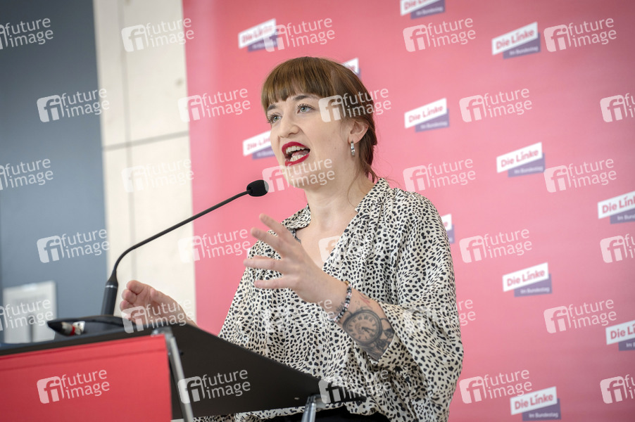 Politik, Statement, Pressekonferenz, PK, Reichstag, Deutscher Bundestag, Demokratie, Parlament, Parlamentsgebäude, Volksvertreter, MdB, Mitglied des Bundestages, Abgeordnete, Politikerin, Vorsitzende der Fraktion Die Linke