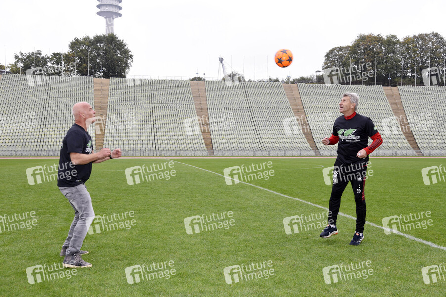 Stefan Lehmann und Klaus Augenthaler beim Fototermin zur sportichen '#WocheChallenge' im Olympiastation München. Unter dem Motto 'Wir können was bewegen!' ruft die Welthungerhilfe zu dieser Challenge auf und bittet um Spenden für eine Welt ohne Hunger. München, 13.10.2020