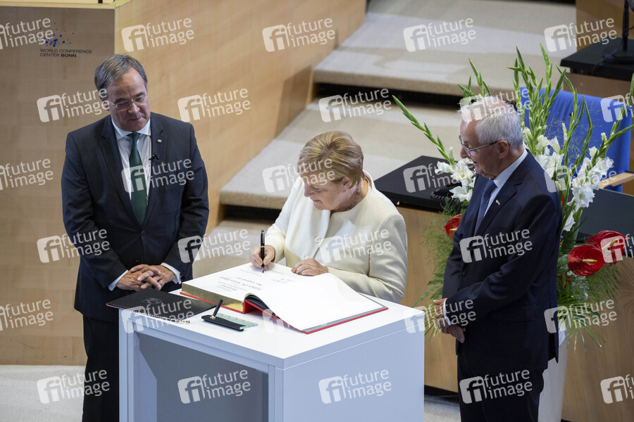 Armin Laschet, Angela Merkel und Klaus Töpfer bei der Verleihung des Staatspreises des Landes Nordrhein-Westfalen 2019 an Klaus Töpfer im WCCB. Bonn, 16.09.2019