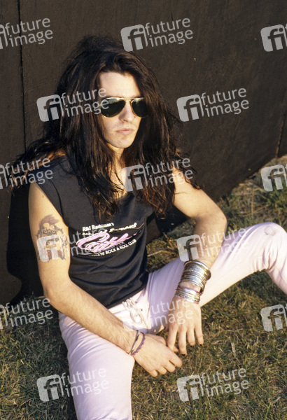 Rachel Bolan von Skid Row bei einem Photoshooting im Milton Keynes Bowl. Milton Keynes, 18.08.1989