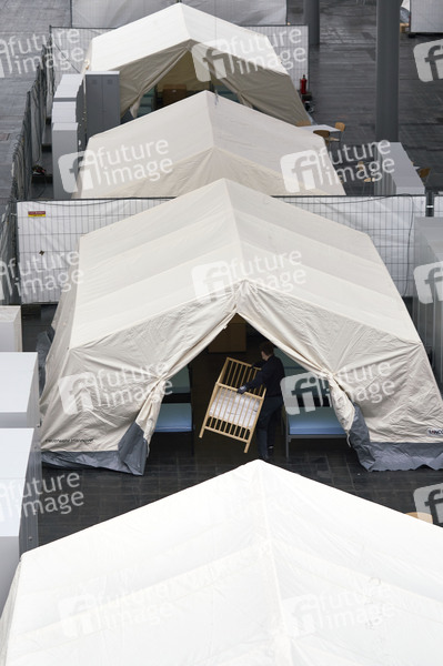 Zeltdörfer-Unterkünfte für ukrainische Kriegsflüchtlinge in der Halle 27 auf dem Messegelände, inklusive Wasch- und Duschmöglichkeiten, errichtet von der Feuerwehr Hannover. Die spätere Versorgung erfolgt durch das DRK. Hannover, 06.03.2022