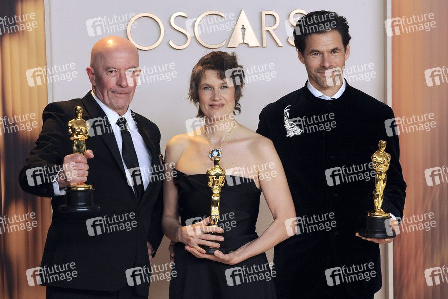 Jacques Audiard, Camille und Clement Ducol mit den Oscards für den besten Filmsong ' 'El Mal' aus 'Emilia Pérez' im Press Room der Oscar Verleihung der Oscar Verleihung 2025 / 97th Annual Academy Awards im Dolby Theatre. Los Angeles, 02.03.2025