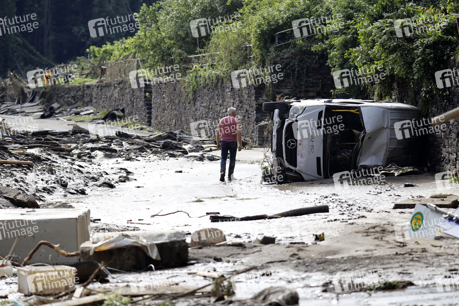 In der Eifel haben heftige Regenfälle und Dauerregen für Überschwemmungen und Überflutungen gesorgt. Im Ahrtal trat der Fluss vielerorts über die Ufer und überschwemmte nicht nur Keller sondern ganze Ortschaften. Im Bild die Straße zwischen Dernau und Walporzheim, die von den Fluten auf einem Abschnitt einfach mitgerissen wurde. Dernau, 15.07.2021