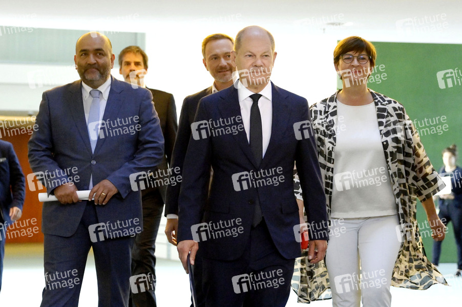 Omid Nouripour, Christian Lindner, Olaf Scholz und Saskia Esken bei einer Pressekonferenz zu den Ergebnissen der Koalitions-Beratungen über finanzielle Entlastungen der Bürger in Deutschland im Bundeskanzleramt. Nach einem Verhandlungsmarathon hat sich die Ampel auf ein drittes Entlastungspaket als Ausgleich für die drastischen Preissteigerungen geeinigt. Berlin, 04.09.2022