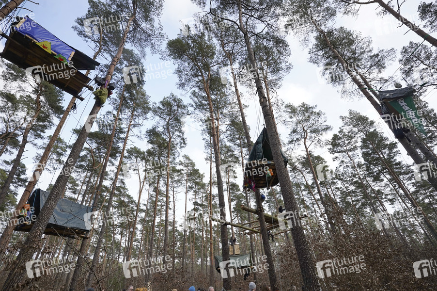 Das Protestcamp von Umweltaktivisten in Grünheide richtet sich gegen die Erweiterungspläne des Tesla-Werks. Die Aktivisten werfen Tesla vor, Umweltverstöße zu begehen, Trinkwasser zu gefährden und Abwasser-Grenzwerten zu überschreiten. Seit Donnerstag halten die Aktivisten einen Teil des Landeswaldes besetzt, den Tesla im Falle einer Erweiterung seines Geländes roden will. Sie haben um die zehn Baumhäuser in mehreren Metern Höhe errichtet und kündigten an, möglichst lange ausharren zu wollen. Auch die Bürgerinitiative Grünheide spricht sich gegen die Erweiterungspläne aus und zeigt sich mit den Besetzern solidarisch. Grünheide, 02.03.2024