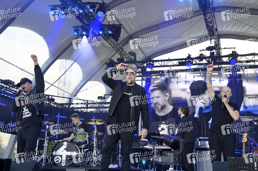 Michi Beck, Smudo und Thomas D von Die Fantastischen Vier live bei der Abschlussveranstaltung auf dem Demokratiefest zu 75 Jahren Grundgesetz auf der Bühne zwischen Kanzleramt und dem Deutschen Bundestag. Berlin, 26.05.2024