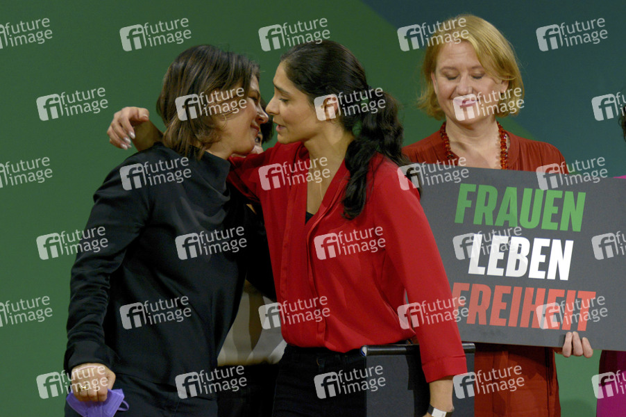 Annalena Baerbock, Pegah Ferydoni und Lisa Paus bei einer Solidaritätsbekundung mit den Frauen bei den Protesten im Iran bei der 48. Ordentlichen Bundesdelegiertenkonferenz von Bündnis90/Die Grünen im World Conference Center. Bonn, 15.10.2022