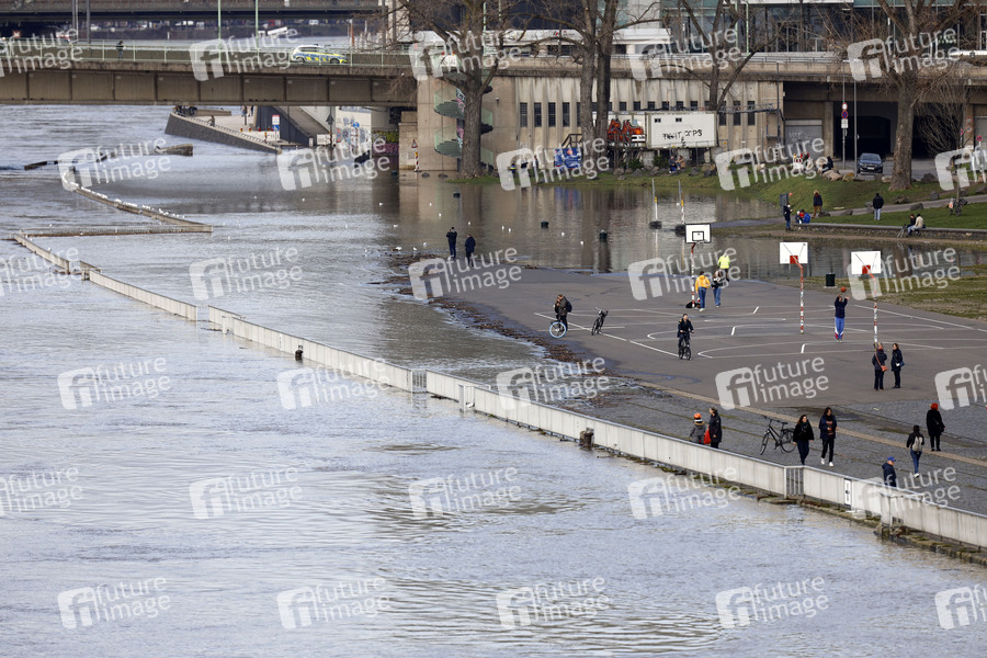 Rheinpegel, Fluss, Rhein, Pegelstand, Pegel, Hochwasser, Rheinboulevard, Pegelmarke, Hochwassermarke, Hochwasserwelle, Scheitelpunkt, Rhein-Pegel, Flussbett, Flut, Schifffahrt, Hochwasserschutz, Wasserstand, Mittelwasser, Tauwetter, Rheinschifffahrt, Rheinufer, Rhein-Ufer, Hochwasserschutzzentrale, Hochwasserwelle, Rheinuferpromenade, Pegel-Nullpunkt, Hochwasserlage, Hochwassermeldedienst, Hochwasserinformationsdienst, Wasserstände, Pegelstände, Wetterlage, ansteigendes Wasser, steigender Pegel, unter Wasser, überflutet, Rheinufer, Schmelzwasser, Wetter, Scheitelpunkt, kritische Marke, Hochwassermarke, Deutz, Deutzer Werft, Symbolbild, Symbolfoto