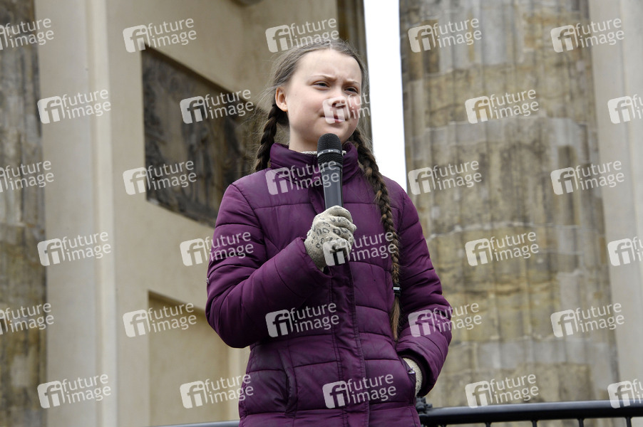Greta Thunberg spricht bei der 'Fridays for Future' Schülerdemonstration gegen die Klimapolitik vor dem Brandenburger Tor. Berlin, 29.03.2019