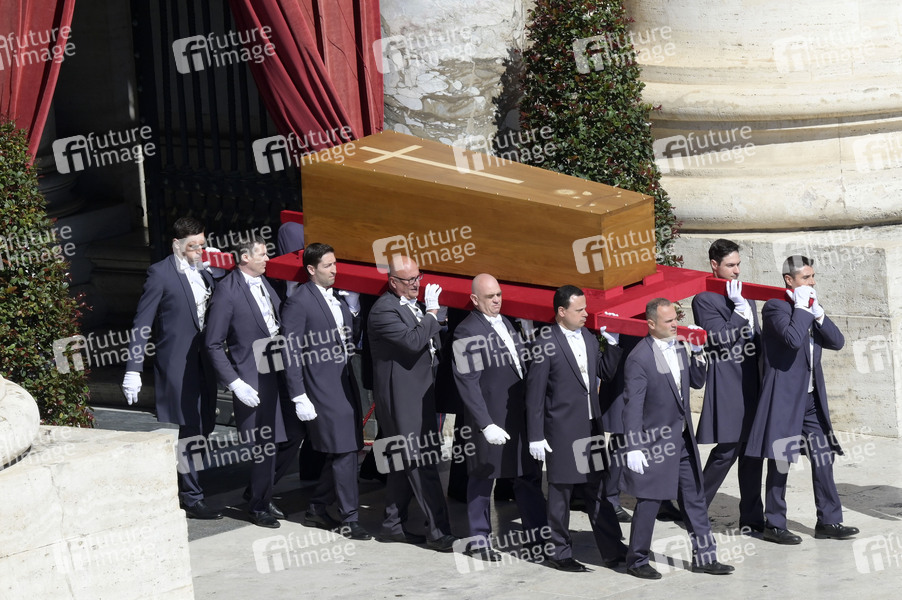 Der Sarg bei der Trauermesse für den verstorbenen Papst Franziskus auf dem Petersplatz. Vatikanstadt, 26.04.2025