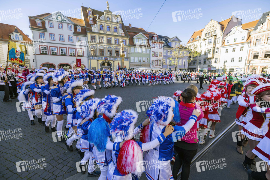 Karnevalisten beim Start des Erfuter Karnevals mit einem Mini-Umzug von ca. 2000 Erfurter Karnevalisten vom Hotel Radisson Blu über den Anger zum Fischmarkt vors Rathaus. Erfurt, 11.11.2022
