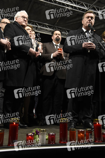 Frank-Walter Steinmeier, Elke Büdenbender, Aiman Mazyek und Claus Kaminsky bei einer Mahnwache für die Opfer des rechtsextremen Anschlags auf dem Marktplatz. Hanau, 20.02.2020
