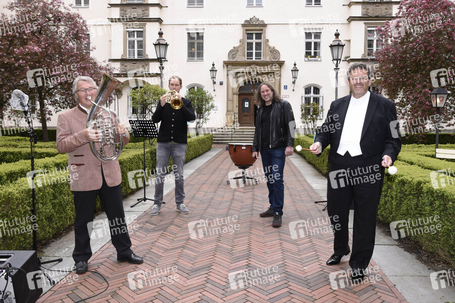 Ernst Hutter, Martin Hutter, Roland Hefter und Mark Mast bei der 'Paukenschlag gegen die Einsamkeit' Konzertveranstaltung der Josef-und-Luise-Kraft-Stiftung für Senioren im Mathildenstift. München, 01.05.2021