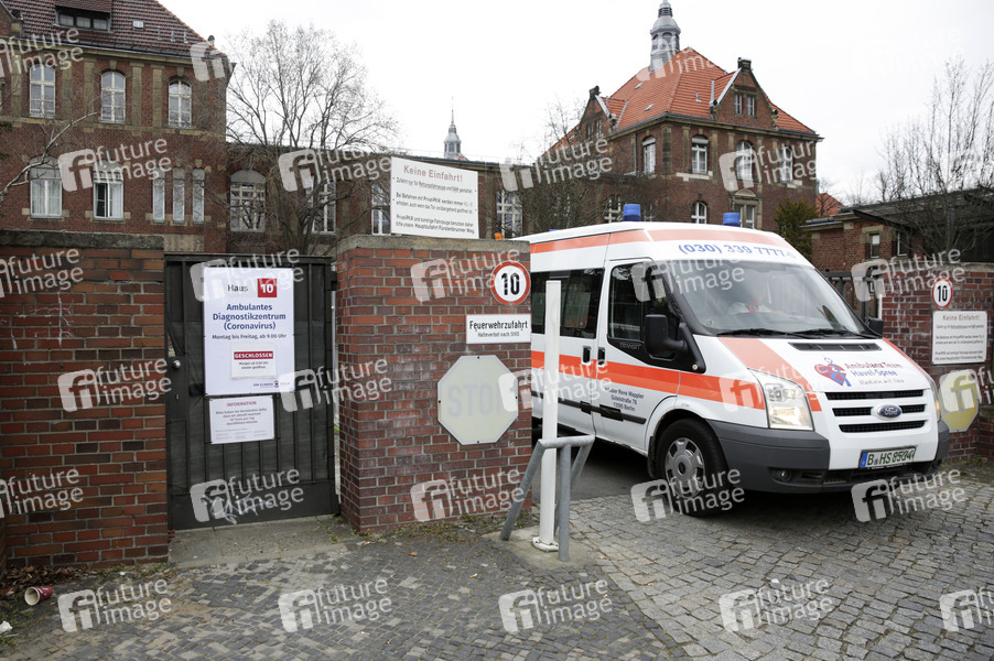 Der Eingang zum Corona Test der DRK Kliniken Westend. Die meisten Berliner halten sich offensichtlich an die Empfehlungen und Maßnahmen der Bundesregierung zur Bekämpfung der Corona-Epidemie. Berlin, 21.03.2020