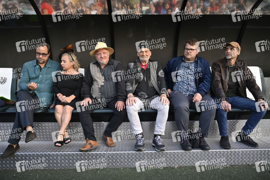 Jan Josef Liefers, ChrisTine Urspruch, Axel Prahl, Claus Dieter Clausnitzer, Björn Meyer und Jan Georg Schütte bei der Premiere des ARD-Krimis 'Tatort - Ein Freund, ein guter Freund' zum 20 jährigen Jubiläum des Münsteraner Tatorts im Preußenstadion. Münster, 30.08.2022