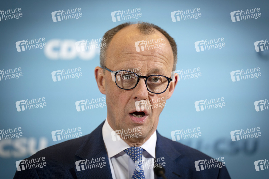 Friedrich Merz beim Pressestatement zur Fraktionssitzung der CDU/CSU-Bundestagsfraktion im Reichstagsgebäude. Berlin, 10.02.2025