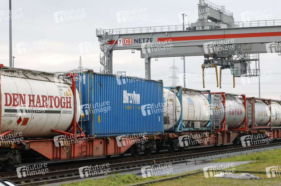Container-Güterzüge beim Fototermin 'DB montiert 400 Tonnen schwere neue Krananlage' im DUSS-Terminal Köln-Eifeltor. Köln, 23.01.2025