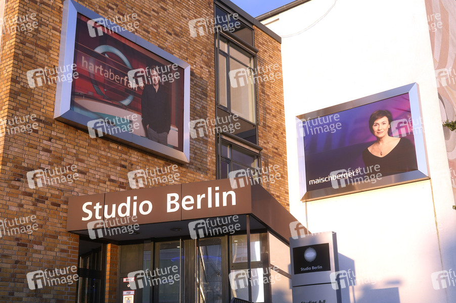 Der Eingang vom Studio Berlin Adlershof mit Plakaten der ARD-Talkshows 'maischberger' und 'hart aber fair'. Berlin, 11.06.2024