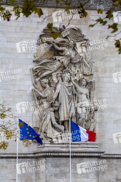 Französische Staatsflagge und Europaflagge bei der 101. Jahrfeier des Waffenstillstands von 1918 am Triumphbogen. Paris, 11.11.2019