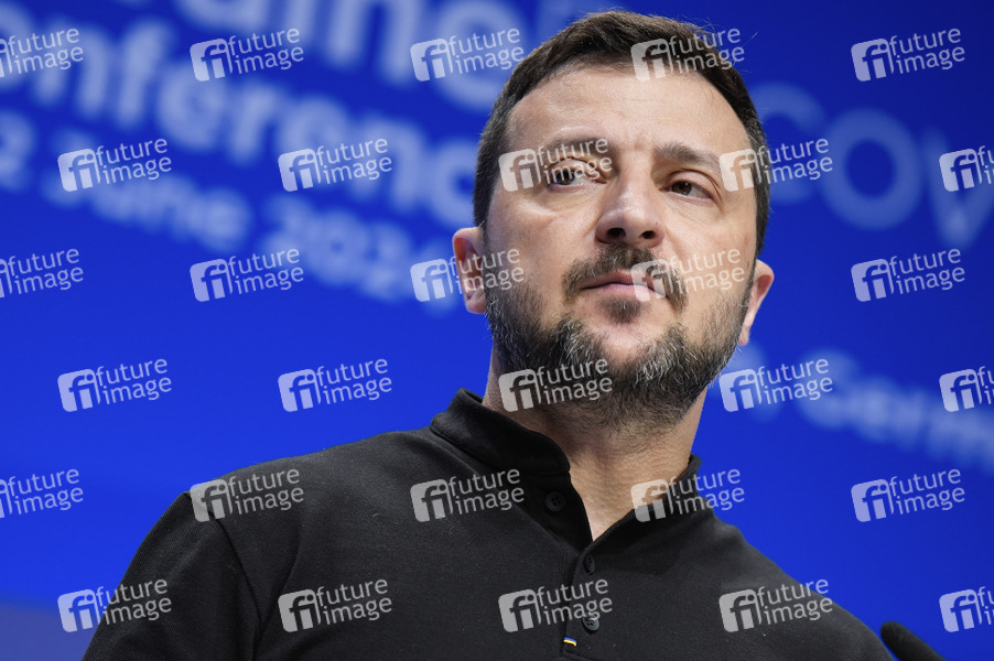 Wolodymyr Selenskyj bei der Pressekonferenz zur Ukraine Recovery Conference 2024 unter dem Motto 'United in Defense. United in Recovery. Stronger together.', auf dem Messegelände. Berlin, 11.06.2024